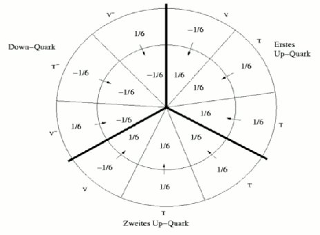 Hier seht Ihr das Ergebnis, wenn sich die drei Tänzer gegenseitig beschenkt haben... Und siehe da, zählt man die elektrischen Teil-Ladungen der "Tänzer-Sechstel" in den drei durch fettere Trennlinien gekennzeichneten Abschnitten zusammen, ergibt sich eine elektrische Ladungsverteilung wie im "modernen" Proton, also zweimal +2/3 der Elementarladung bei den Up-Quarks und einmal -1/3 der Elementarladung beim Down-Quark. |